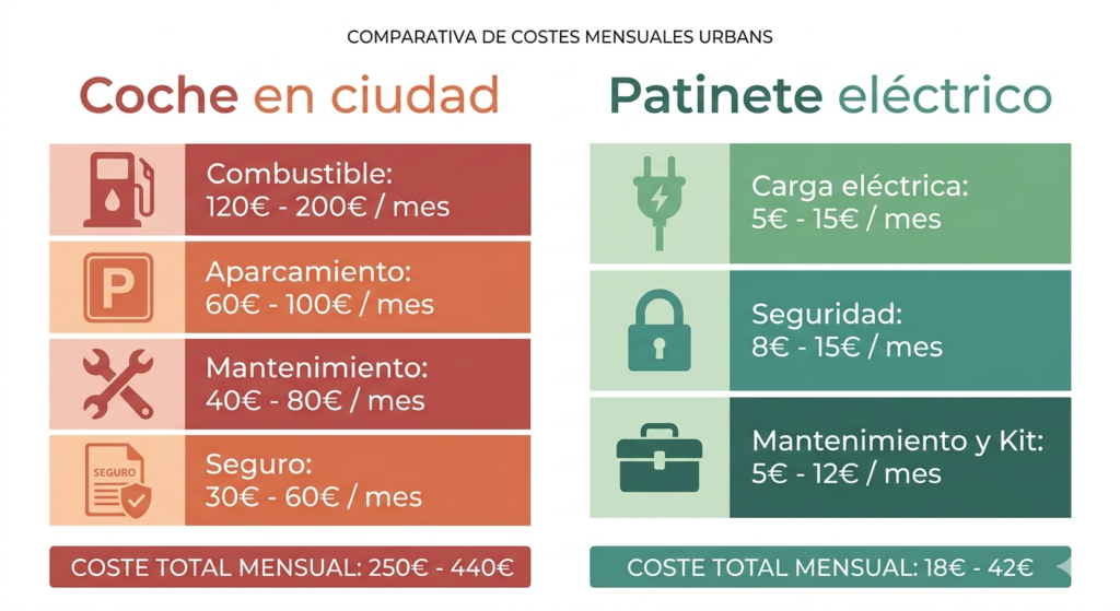 Si vives en ciudad, tus trayectos diarios son cortos, tienes dónde guardar el patinete en el destino y no dependes del coche para cosas que el patinete no puede hacer, la ecuación económica en este momento es clara: el patinete eléctrico como alternativa al coche en trayectos urbanos ahorra dinero, y con el precio del combustible como está, ese ahorro es más visible que nunca.
